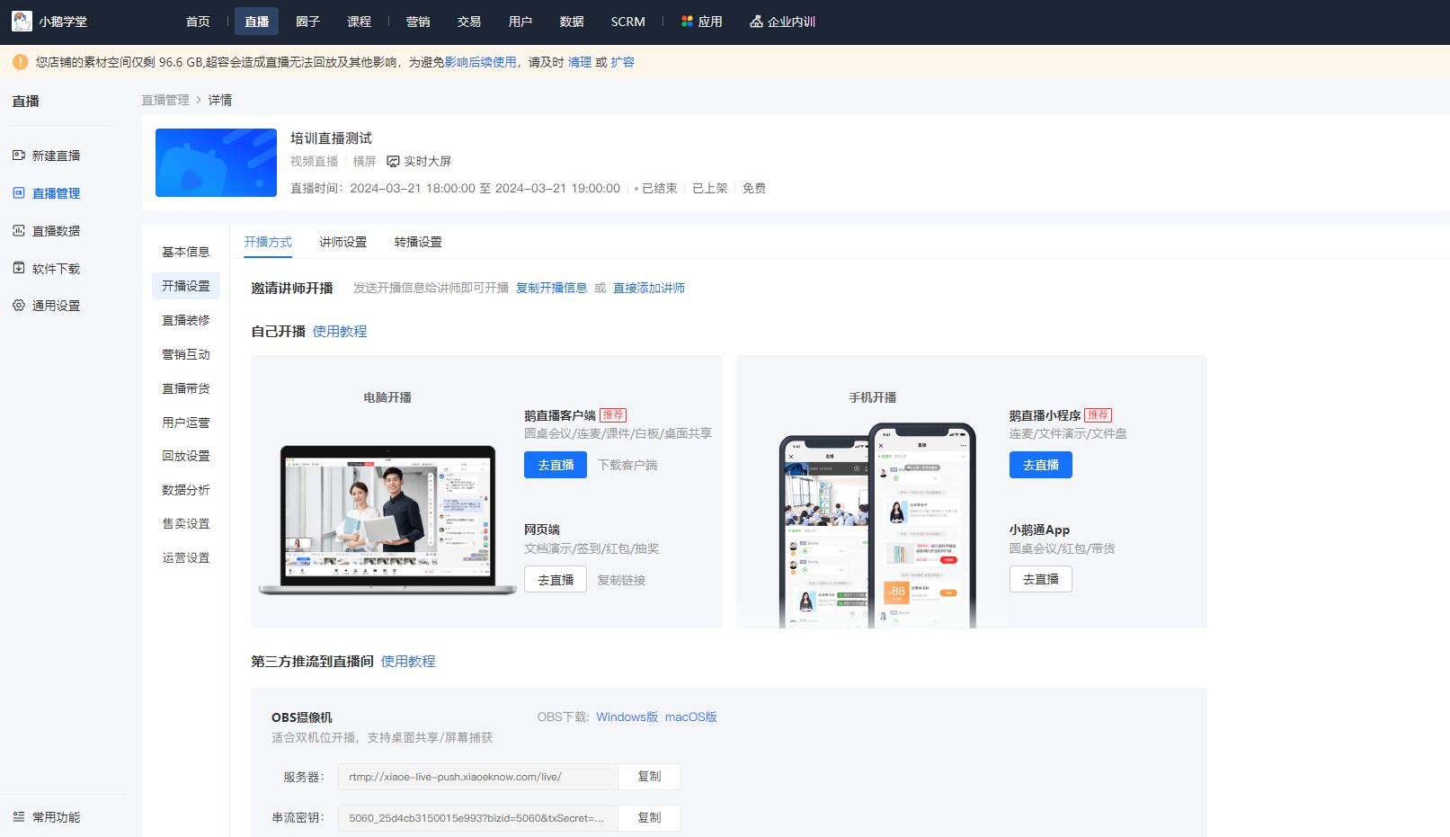 很多小鹅通商家用户直播的时候都是用小鹅通的鹅直播工具,但是还有一些小鹅通商家用户用obs直播,那么用obs直播的时候怎么获取直播间的推流地址和秘钥呢? 首页,小鹅通商家用户登陆小鹅通店铺管理后台,找到直播-直播管理,创建一个直播间,进入直播间管理-开播设置-开播方式里面就可以找到直播间推流地址和秘钥,复制直播间推流地址和秘钥到obs设置好就可以用obs直播了。 有的小鹅通商家用户创建好直播间之后为什么找不到直播间推...