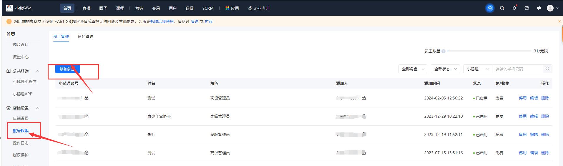 小鹅通商家用户怎么在自己店铺后台添加店铺运营者?