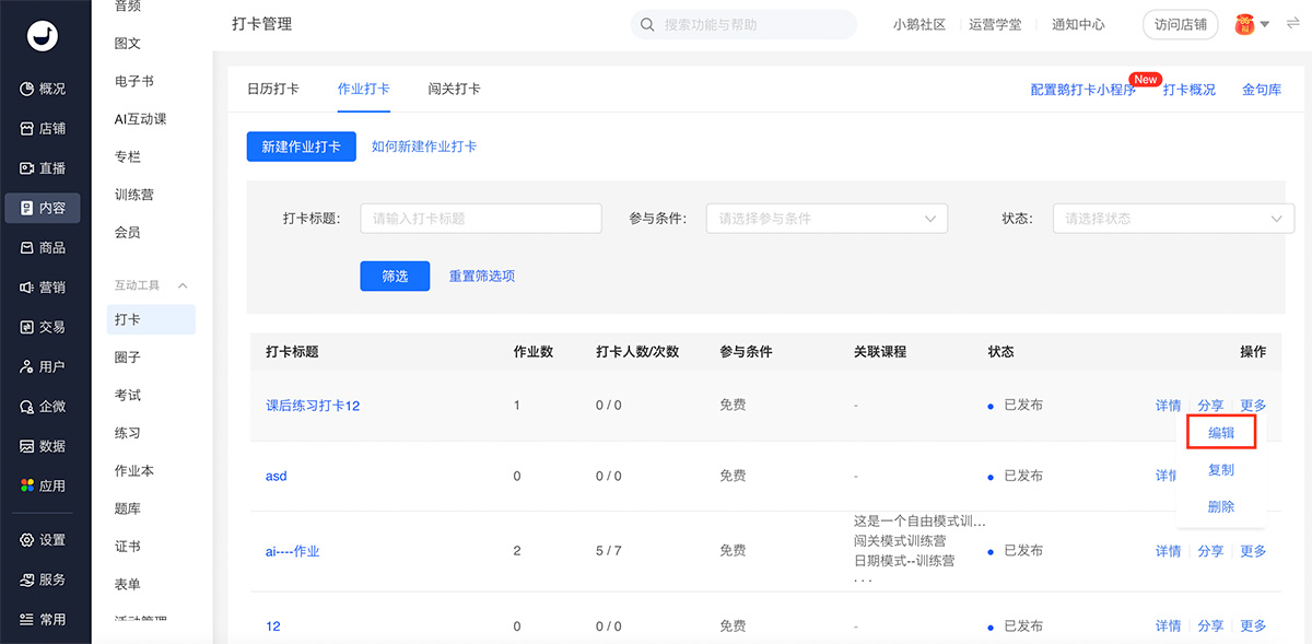 可以的,对于作业打卡及闯关打卡,可以在编辑打卡页开启防作弊模式,开启后,学员需完成打卡才可查看其他学员的打卡内容。