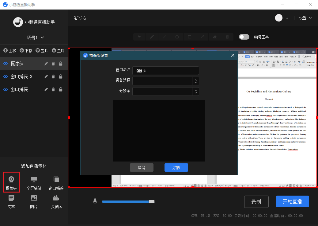 如果大家选择入驻的是小鹅通平台,那么就可以在个人店铺中创建一个直播课程,创建之后邀请自己成为讲师,然后就可以使用PC端的小鹅通直播助手开始录制了。在录制PPT的时候把人像录制进去其实很简单,只需要捕获了PPT窗口之后,添加一个摄像头素材就可以了,但是在录制之前一定要对素材进行调整,否则摄像头素材很有可能会遮挡住PPT。