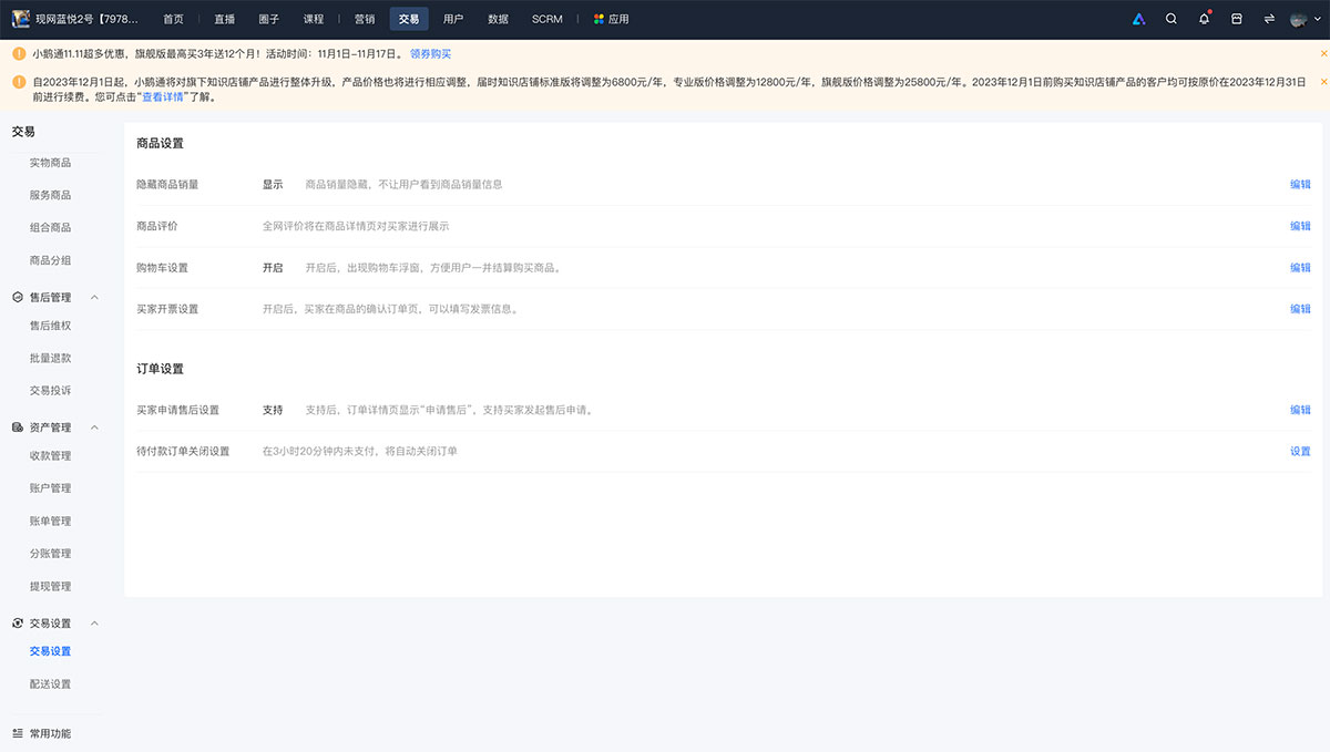 操作路径:商家管理后台-交易-交易设置-待付款订单关闭设置