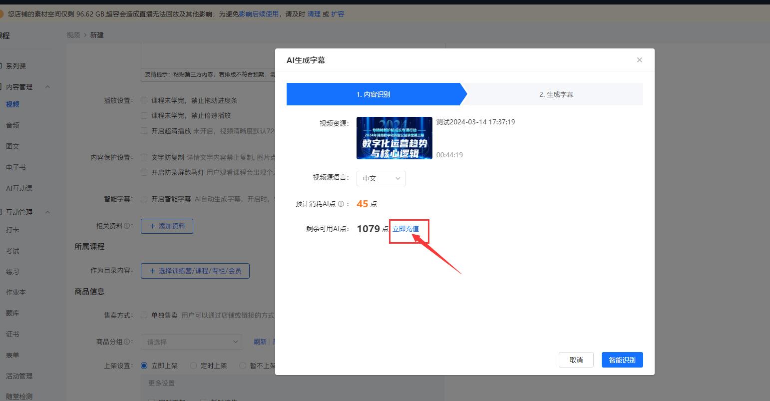 首先,小鹅通商家用户登陆到小鹅通店铺管理后台,然后点击课程-视频-新建视频,在创建视频课程的时候点击开启智能字幕就可以给视频课程添加字幕了。