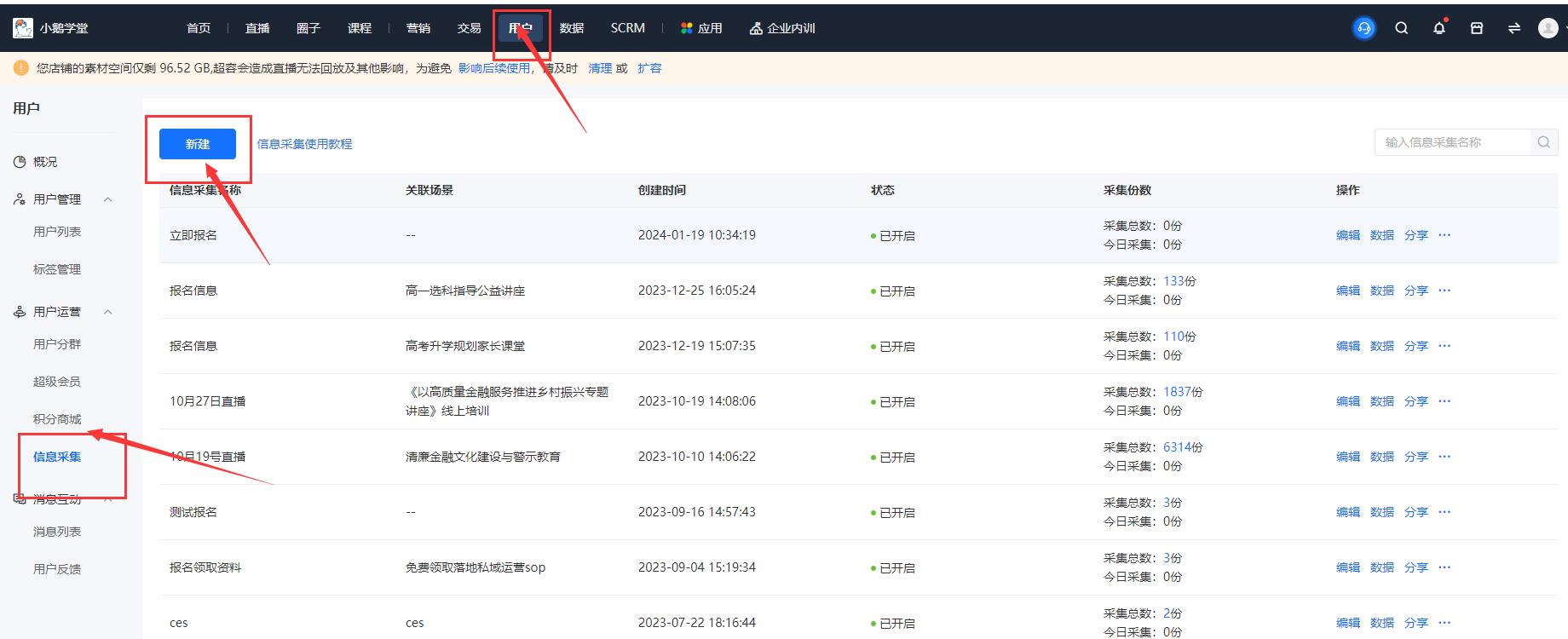 三、然后需要小鹅通商家用户点击“用户”——“用户运营”——“信息采集”创建一个信息采集,设置好直播间要采集的信息,最后关联场景选择要采集的直播间,如果直播间是免费进入的信息采集选择“课程详情页”,如果直播间是收费的话信息采集就选择“购买确认页”。