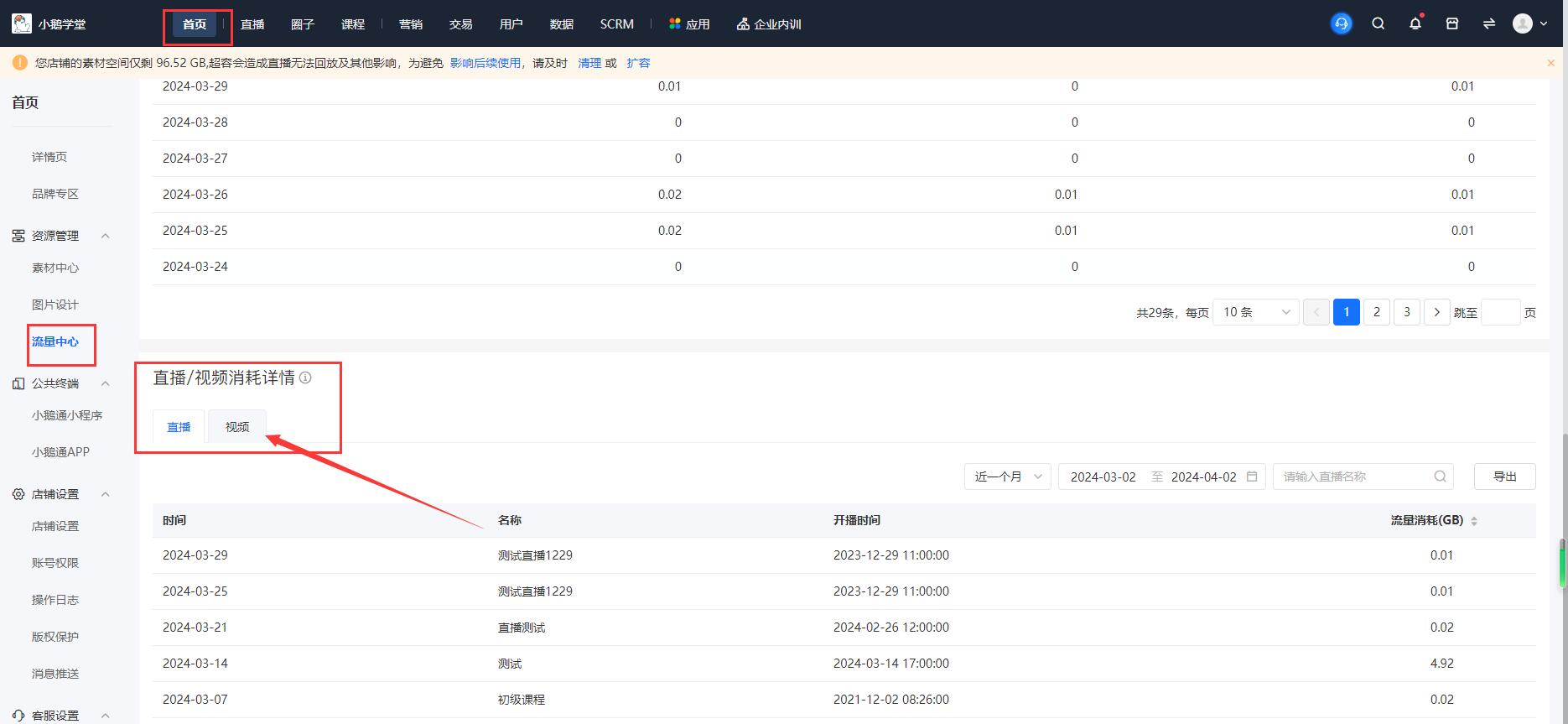小鹅通商家用户登陆到小鹅通管理后台之后,点击“首页”——“资源管理”——“流量中心”可以查看流量消耗数据,也可以查看每次直播,直播间消耗的流量数据。