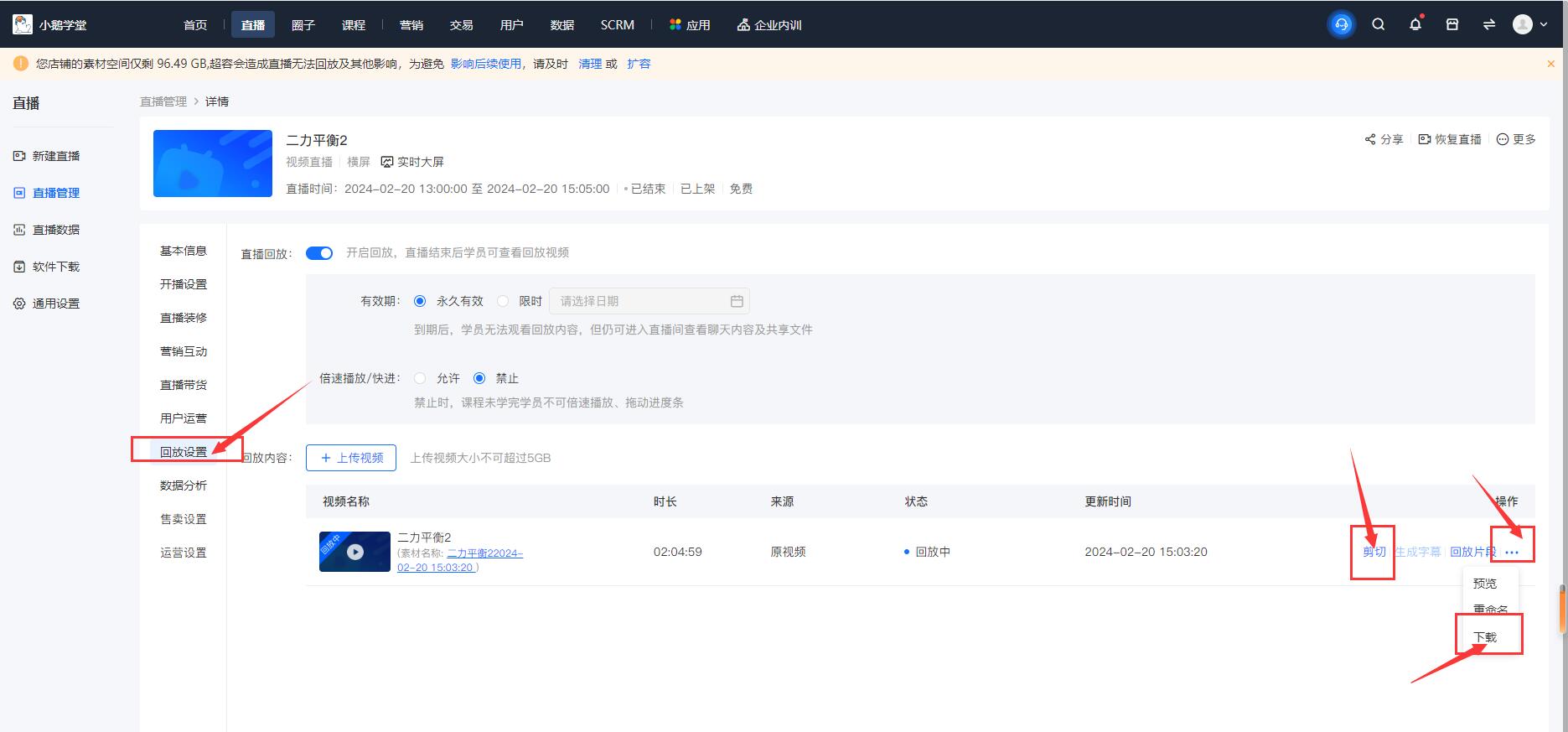 小鹅通直播回放视频下载剪辑,需要小鹅通商家用户登陆到小鹅通店铺管理后台,点击“直播”——“直播管理”,找到这个直播间,点击这个直播间后面的“管理”进入直播间详情,然后找到“回放设置”里面回放视频,点击后面的“剪辑”按钮就可以在线剪辑回放视频,点击回放视频后面的三个点就可以去下载直播回放视频保存到电脑本地上。